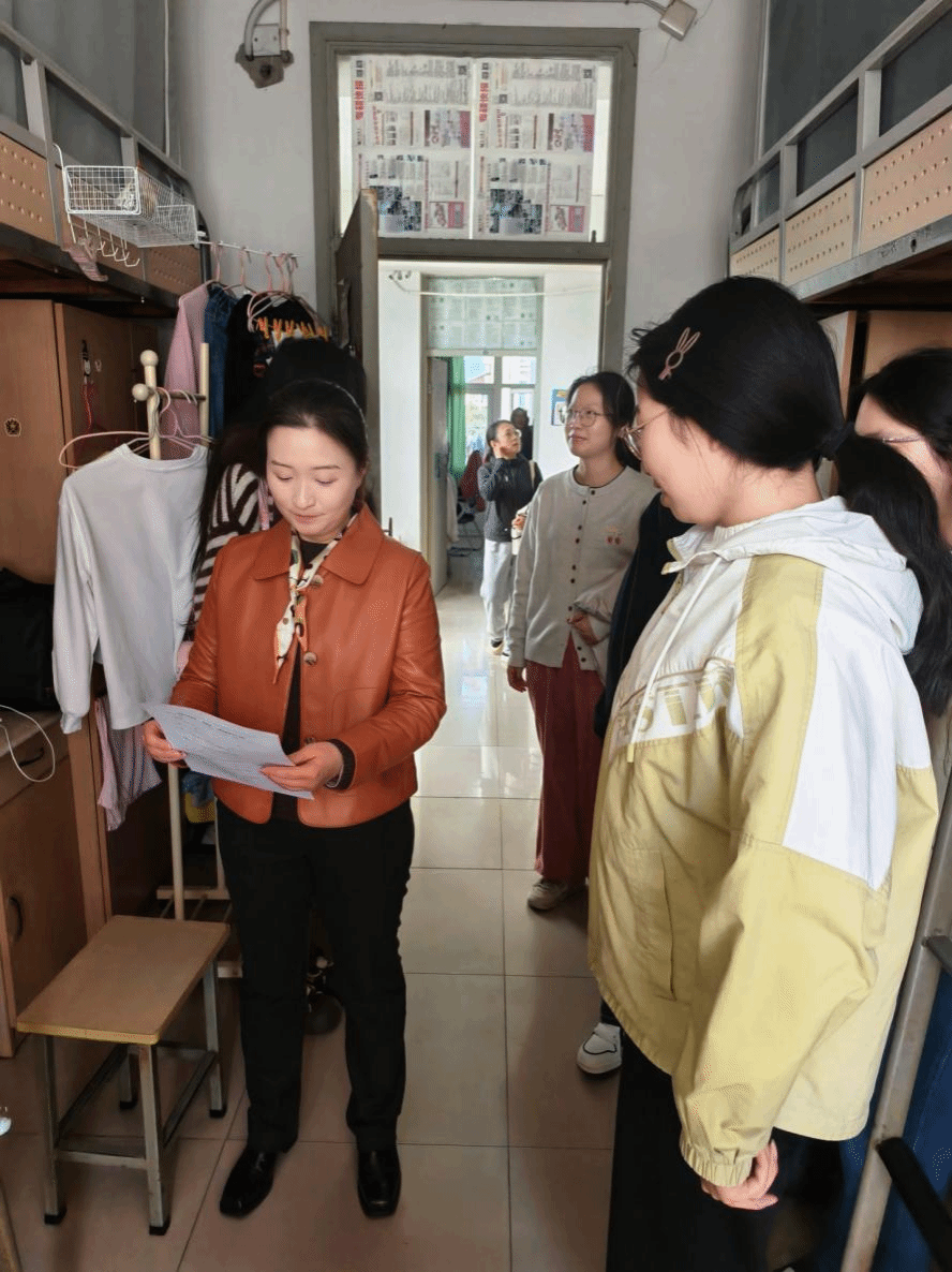 走访过程中,韩铖与同学们进行了亲切交流,仔细询问了同学们近期的学习和生活情况,鼓励同学们在日常学习之余,积极参加体育锻炼,强健体魄;要合理安排时间,作息规律,以饱满的精神状态投入到学习生活中。她还叮嘱同学们要牢固树立安全意识,提醒同学们要擦亮眼睛,提高辨别能力,警惕电信网络诈骗。检查小组对宿舍用电安全、宿舍卫生进行了仔细排查。对于发现的问题,现场提出整改意见。同学们纷纷表示,通过这次检查,进一步认识到了宿舍安全卫生的重要性,将认真按照学校要求,自觉维护宿舍环境,共同营造安全、整洁、和谐的生活空间。