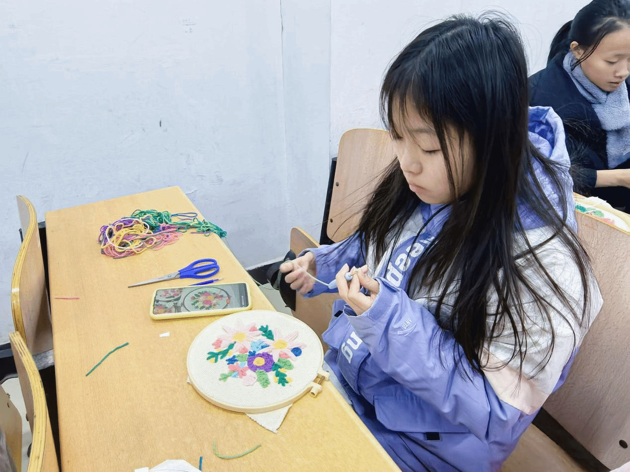 活动伊始,同学们满怀着期待与好奇,在简要的教学指导后,大家纷纷拿起独特的戳针和五彩的毛线,在绣布上开始了自己的创作,每个人都沉浸在专注而愉悦的氛围里。伴随着戳针轻快的“嗒嗒”声,同学们将天马行空的想象力和细腻的心思,一针一线地“戳”进画布。简单的线条逐渐变得丰满,单调的色块开始焕发生机,一个个充满个性的图案在指尖下慢慢绽放。