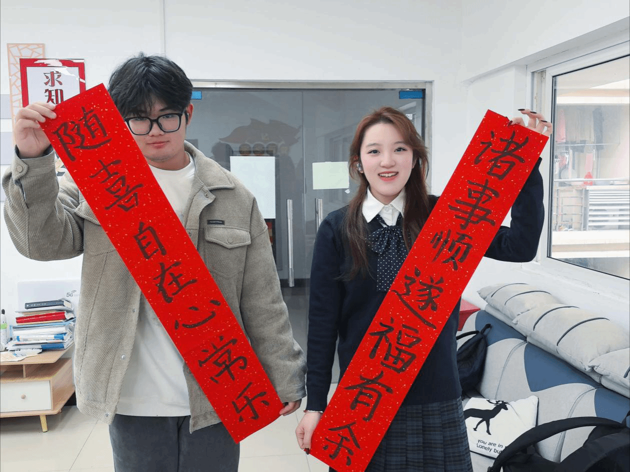 活动现场,红纸铺展,墨香四溢。同学们踊跃参与,无论是书法爱好者挥毫泼墨、展示功底,还是初次尝试者提笔临摹、感受韵味,大家都沉浸在对新春的期盼与对传统文化的独特魅力之中。一笔一划,书写的是对学业进步、生活顺遂的祝愿;一字一句,传递的是同窗之间、朋辈互助的温情关怀。同学们纷纷表示,在紧张的期末复习间隙,能静下心来写春联,不仅可以体验传统文化的魅力,更是一种有效的放松和调节。现场同学们相互交流创作心得、欣赏彼此作品,欢声笑语此起彼伏,温暖氛围萦绕整个社区。