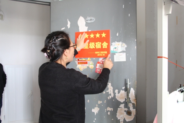 老师和同学们走访了此前被评选为五星级文明宿舍的4021和4024,陈书记实地察看宿舍卫生情况并与两个宿舍的同学们亲切交谈,表彰她们的优秀表现,并希望她们继续保持,再接再厉,并亲自为获奖宿舍挂牌。挂牌活动结束后老师们和获奖同学一起合影留念。