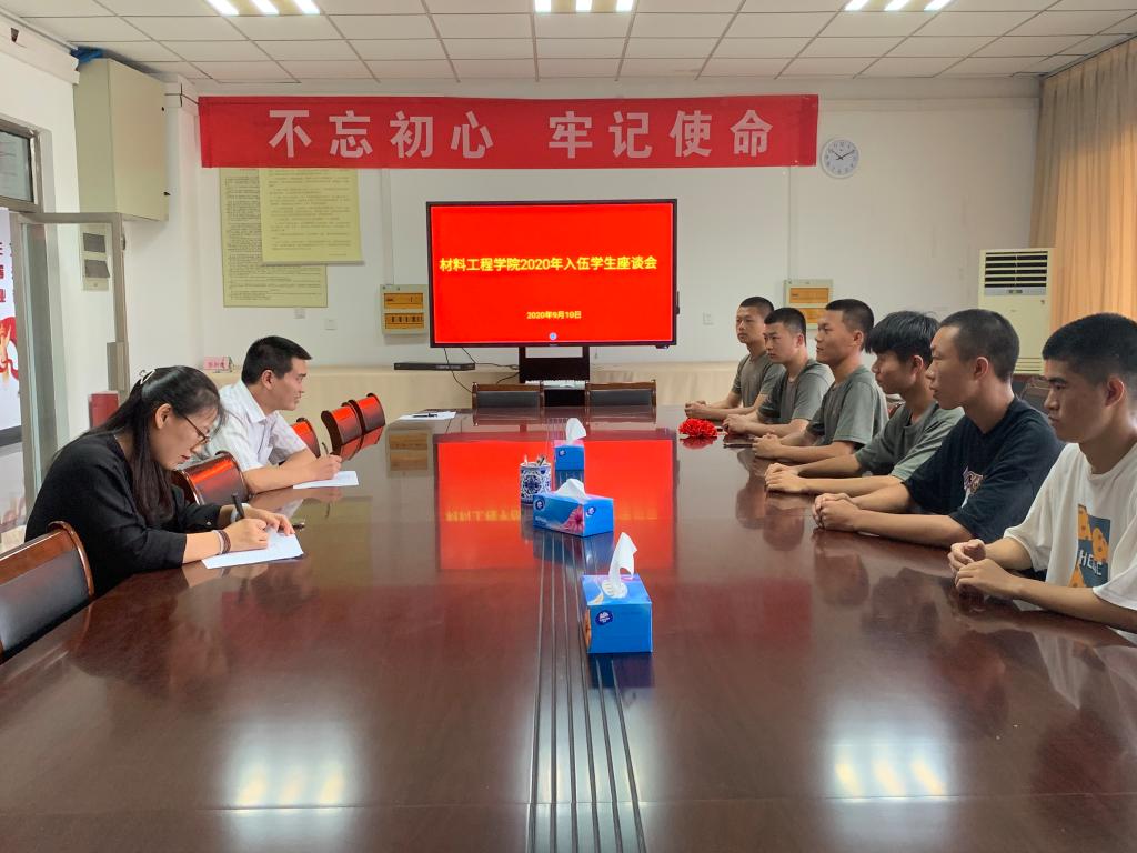 9月10日上午10:00,永利yl23411集团在学院会议室召开2020年应征入伍学生座谈会。永利yl23411集团党委副书记(主持工作)喻强、党委副书记陈智慧、学院征兵工作负责辅导员王亚男出席,2020年入伍学生代表18材料科学与工程刘子诚、18材料科学与工程(w专转本)葛凌飞、18材料科学与工程(单)徐乐乐、19材料科学与工程(视光材料与应用)(2)卢森、19材料科学与工程(视光材料与应用)(1)韩羽洲、16材料科学与工程(视光材料与应用)(1)王政参加本次会议。