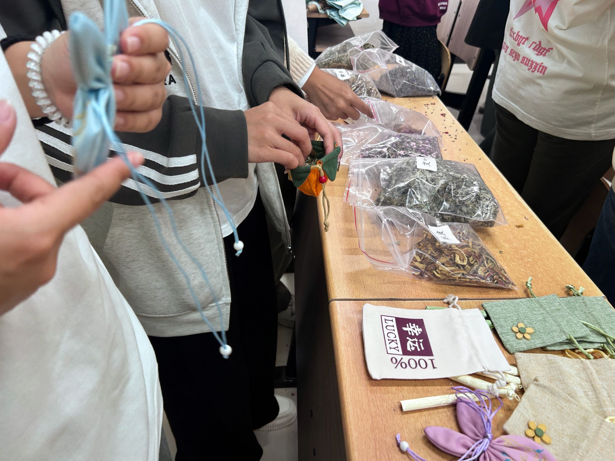 走进活动现场,同学们就被摆在桌上的一袋袋香料、中草药吸引住了目光,包括艾叶、陈皮、玫瑰花、薰衣草、藿香等,还有各式各样精美的香袋罗列在桌上,引得大家跃跃欲试。同学们兴致勃勃地挑选出自己心仪的香袋,“我喜欢玫瑰花,多放一点,再加点艾叶……”,大家纷纷根据自己的喜好与需求,将各种香料添入囊中。当一枚枚精致独特香囊制作完毕后,同学们聚集在一起,互相欣赏着彼此的作品,感受着满屋的芬芳香气,为本次活动画上了圆满的句号。