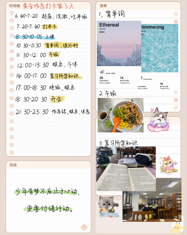 活动伊始,参赛学生纷纷制定未来21天的作息规划,各有千秋,丰富多彩。活动期间,同学们每天上传自己的打卡记录,完成晨读签到、课堂学习记录、晚自习打卡及运动锻炼等环节,像朋友一样互相分享着日常,用实际行动践行自律承诺,展现出不同的生活与学习轨迹。在激烈的角逐中,朱桂辛、乔成慧、张璇等同学脱颖而出。同学们纷纷表示收获颇丰,“起初只是抱着尝试的心态参加,但坚持下来发现,规律作息不仅让我精神状态更好,学习效率也大幅提升。”