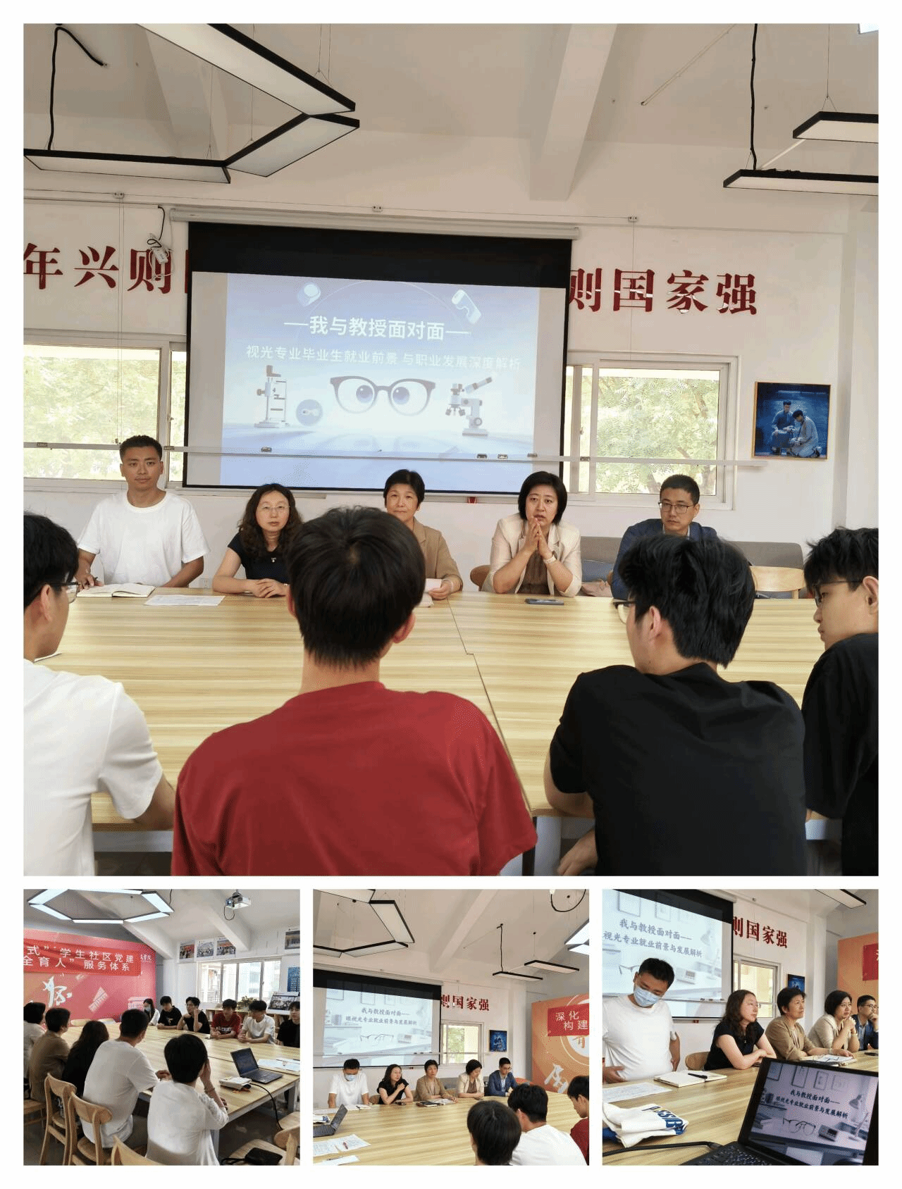 2025年5月28日,永利yl23411集团在南区08栋一站式学生社区开展“视光与眼视光专业就业前景与职业发展双解析”师生面对面活动。活动围绕“精准服务毕业生”,开设“视光材料专业就业前景解析”“眼视光专业职业发展研讨” 两场主题座谈。学院党委书记陈健、视光系李新华、贾志超、王玲、亓昊慧、季雷、陈祥等多位教师代表,与21级视光材料与应用、眼视光学专业毕业生深入交流,共同探讨职业发展路径。