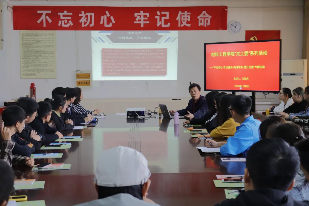 为了让同学们合理规划大学四年的学习生活,根据永利yl23411集团“关工委”的工作安排,2019年11月7日下午永利yl23411集团在工科楼会议室举办“不忘初心、牢记使命,完成学业、提升价值”专题讲座。讲座特邀永利yl23411集团原院长王淮庆为大家主讲,学院党委副书记(主持工作)喻强、综合办公室主任韩奕出席,2019级新生班代表40余人参加本次活动。