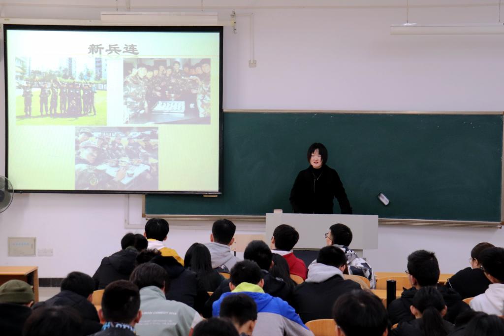 讲座伊始,王老师向同学们简单介绍了本次讲座的主讲人赵宁同学的个人事迹,同学们都对这位学姐的军旅生活展现出了浓厚的兴趣。随后,赵宁同学从体能训练、日常起居、所获荣誉等方面介绍了自己的军旅生活,在展现自己军旅生涯的艰辛的同时,更激励同学们要培养艰苦奋斗的品质。赵宁同学还讲述了自己退伍复学后参加众多活动的经历,告诉同学们她是如何积极转换角色认知,重新融入大学生活的。最后,王老师向同学们介绍了参军入伍的要求、流程、优待政策,并鼓励有意愿的同学们积极参军入伍,为国家做出一份贡献。